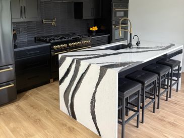 Cambria Quartz Countertop The Bentley as a Focal Point in this Tricorn black Modern Kitchen.