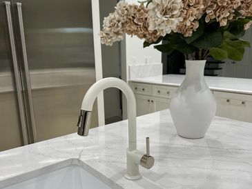 Kitchen Remodel with Cambria Quartz Countertops and Trendy White Faucets.