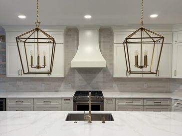 Modern chic kitchen with custom white cabinets, two different Cambria quartz countertops and gold hardware.