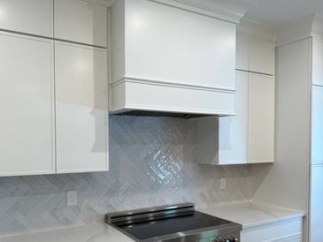 New Two Toned Apartment Kitchen with Thin Shaker Cabinets and a Beautiful Herringbone Laid Tile Backsplash.