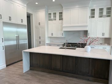 Our Two Toned Kitchen Remodel with West Highland White and Realist Beige Shaker Cabinets. This Paired with Champagne Bronze Fixtures and a Staggered Backsplash gives for a Timeless Look.